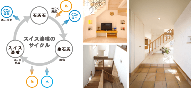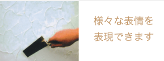 石灰の骨材を配合した、コテ塗りの風合いがひきたつスイス漆喰。厚みをつけた施工が可能ですので、高級感のある仕上がり。テクスチャーも自由自在。調湿・消臭などの効果を充分に生かすことができます。